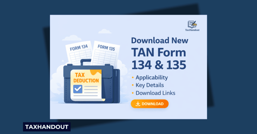 Posted inIncome Tax Update Download New TAN Form 134 & 135 (Income Tax Rules, 2026) The Income Tax Department has introduced new TAN application forms April 2, 2026 Posted inIncome Tax Update Form 121 Introduced: Replaces Form 15G & 15H | Income Tax Rules, 2026 The Income Tax Department has made a major structural change March 31, 2026 Posted inIncome Tax Update Download New PAN Card Form 93/94/95/96 The Income Tax Department has finally replaced Form 49A and March 27, 2026 Posted inIncome Tax Handout Section 43B(h) of Income Tax Act – Payment to MSME Explained (2026 Guide) Businesses in India regularly purchase goods and services from Micro March 16, 2026 Posted inGST Handout E-Invoicing under GST (2026 Guide) E-Invoicing is one of the most important compliance requirements under March 11, 2026 Posted inGST Handout GST on Tobacco Products (Effective from 01.02.2026) The GST treatment of tobacco products has undergone a significant March 2, 2026