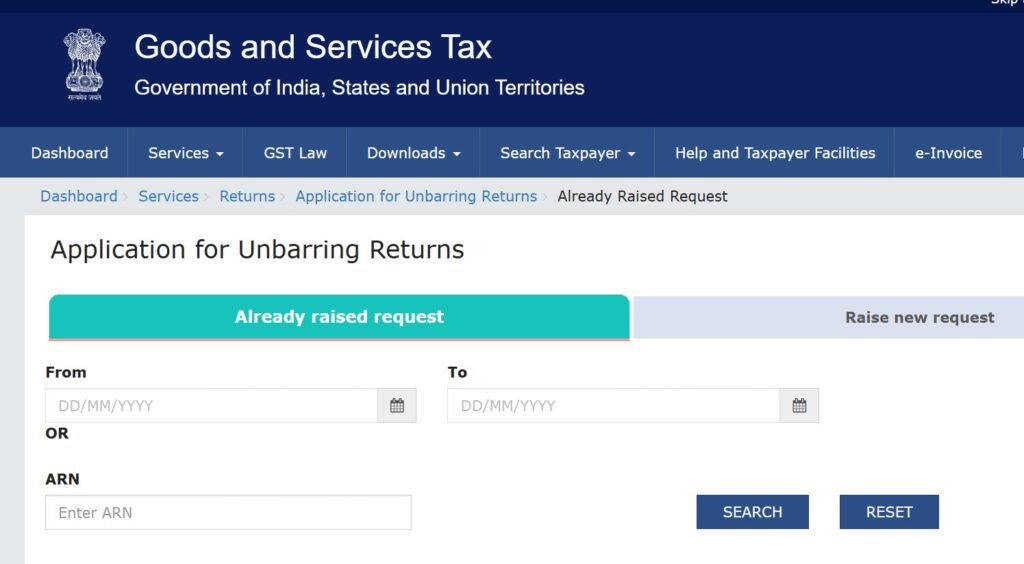 Dashboard → Services → Returns → Application for Unbarring Returns